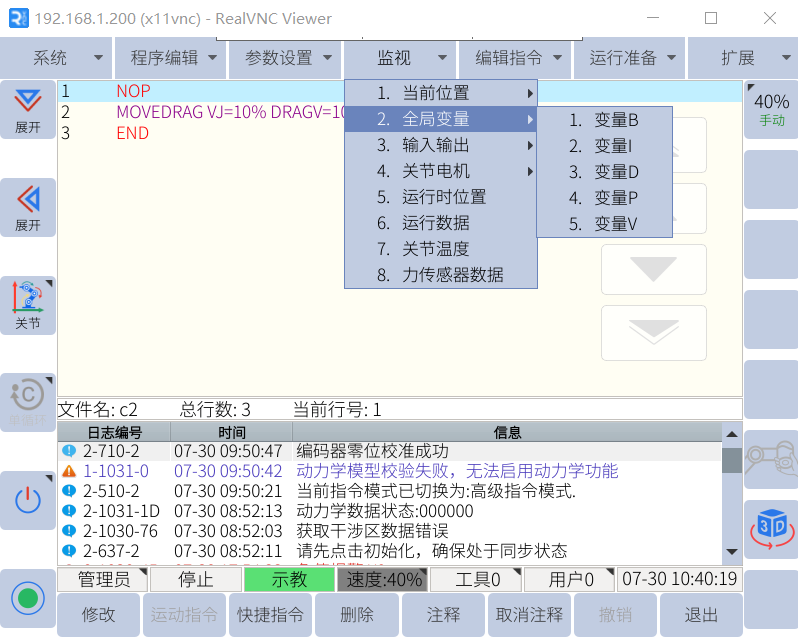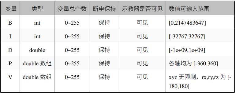 如表格所示,milan.米兰中国机器人全局变量分为五种均可通过 jbi 和 lua 进行操作,通常使用情况下,会使用 B、I、D 变量进行 逻辑的交互和简单数据的传递,而 P 变量用作放置关节数据,V 变量用作放置笛卡尔数据。 P 变量和 V 变量存放对应的数据后,可以使用示教器手动移动到目标位置,或者通过移动指令 直接到指定的位置。