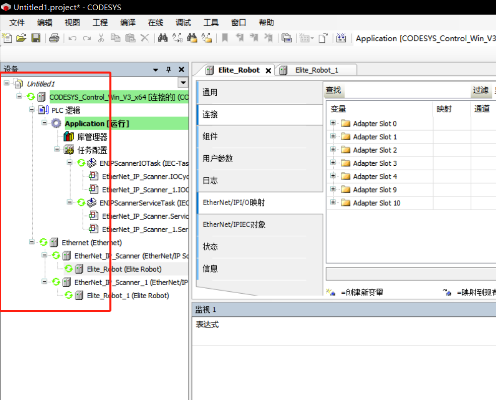 Adapter Slot 1: 32 个 32 位 int 输入寄存器,地 址范围 [0,31] 传输方向 O->T(codesys--elite)
