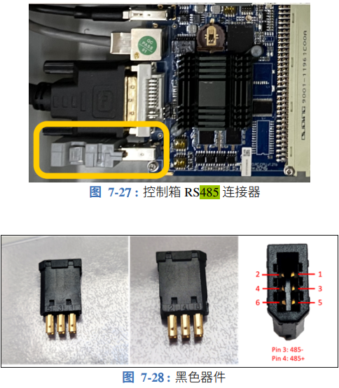 milan.米兰中国机器人EC系列支持RS485通讯,用户可以通过将 RS485 设备连接到图 7-27 中所示的连接器来从控制柜执行串行通信。为了能在控制柜中设置 RS485 连接器,必须拆掉串口连接 器,并将 RS485 线焊接到黑色连接器背面的金属触点,如图 7-28 所示。黑色塑料装置的正反 面分别标有 PIN“1 3 5”和“2 4 6”。PIN3 应焊接到 RS485B,PIN4 应焊接 到 RS485A。该 接口支持的最大波特率为 500Kbps。