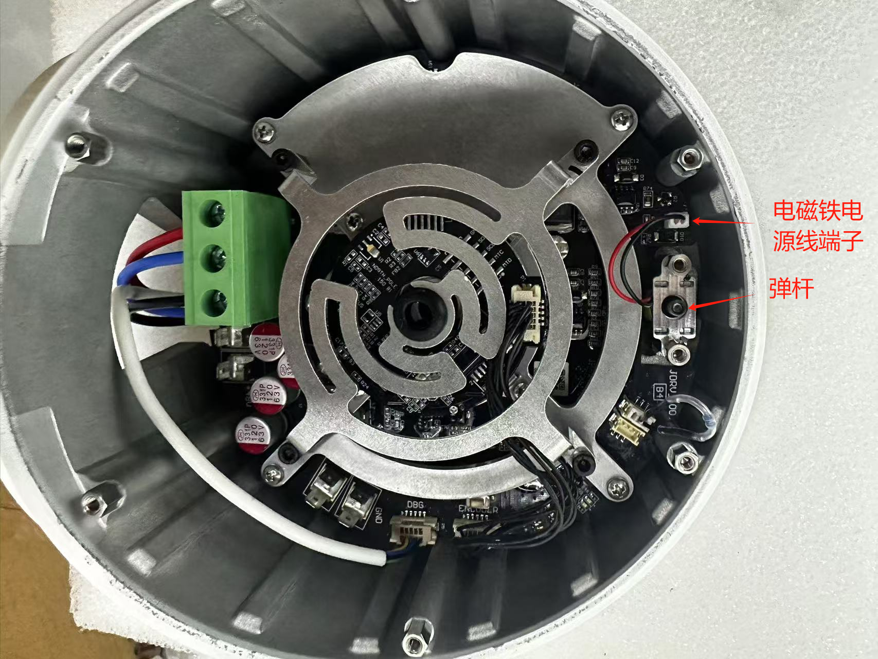 4. 将电磁铁从关节内取出,注意:电磁铁下面还有一个弹杆,弹杆下有弹簧,没有电磁铁弹杆顶着,机器人如果是倒装会掉出来,下面的弹杆不需要取出。