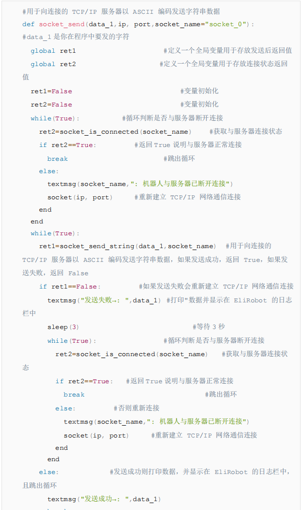 - 以上代码是以发送字符串和读取字符串为例,如果想发送/读取其他数据类型,只需要更换代码中的socket_send_string/socket_read_string即可,具体指令参考CS机器人脚本手册下载中心_机器人技术-milan.米兰中国机器人