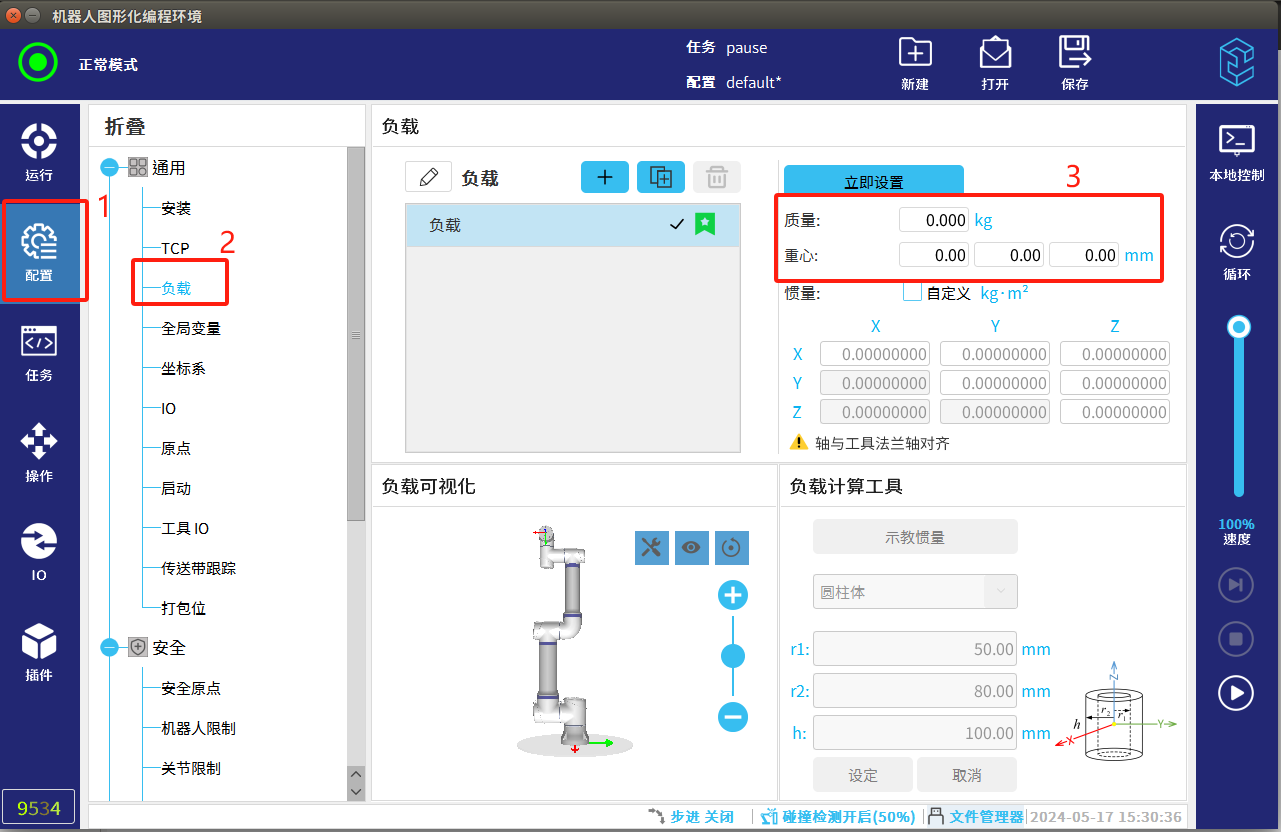 检查负载数据过高或过低、重心是否设置正确,设置的数据与实际差异太大可能会引起抖动!如图2-2-1所示查看负载设置的是否正确。