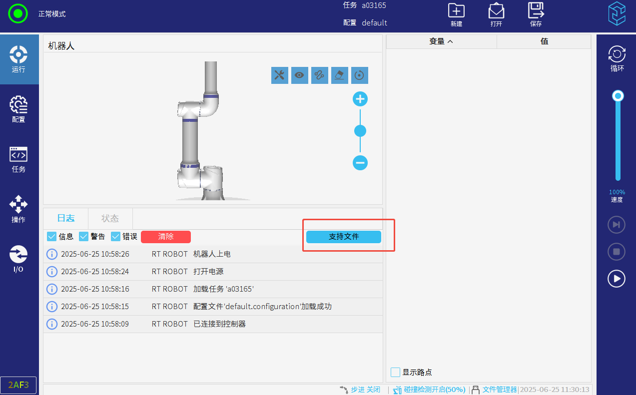 发送后机器人应该会按照脚本指令运动,无论是否运动,我们都可以导出支持文件查看: