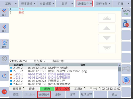 1.在程序编辑页面,将光标移动到要插入指令位置的前一行。