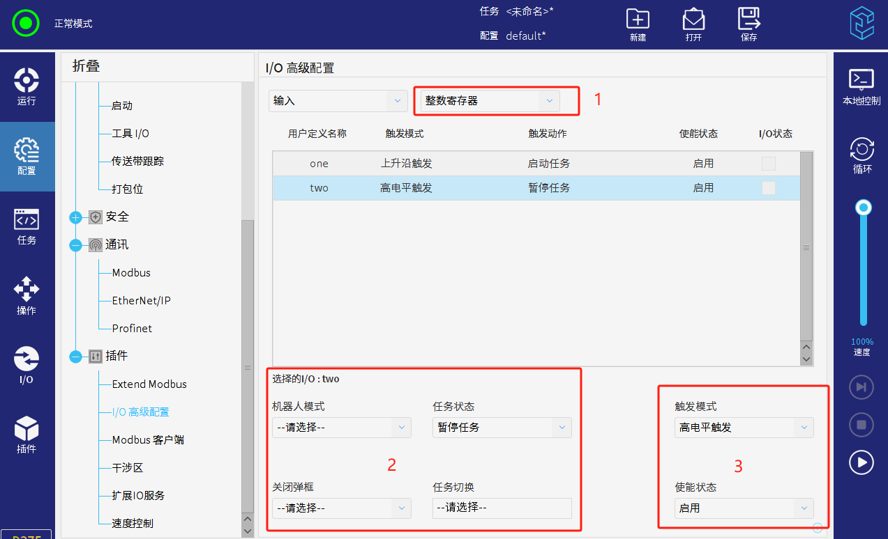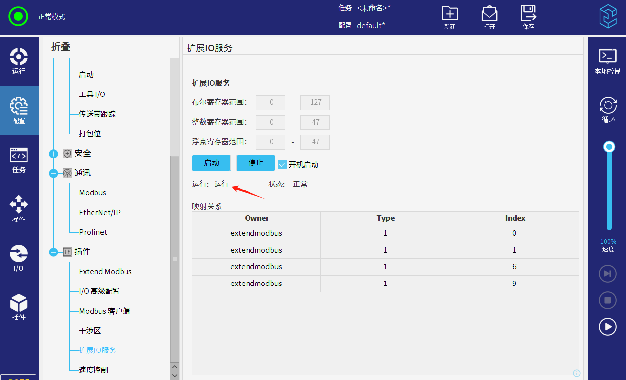 项目通常会需要通过modbus通讯来让PLC控制机器人的启动和暂停,还有反馈 机器人的运行,暂停状态等。但是目前通过modbus来实现必须牺牲一个IO,MODBUS扩展插件可规避占用物理IO。