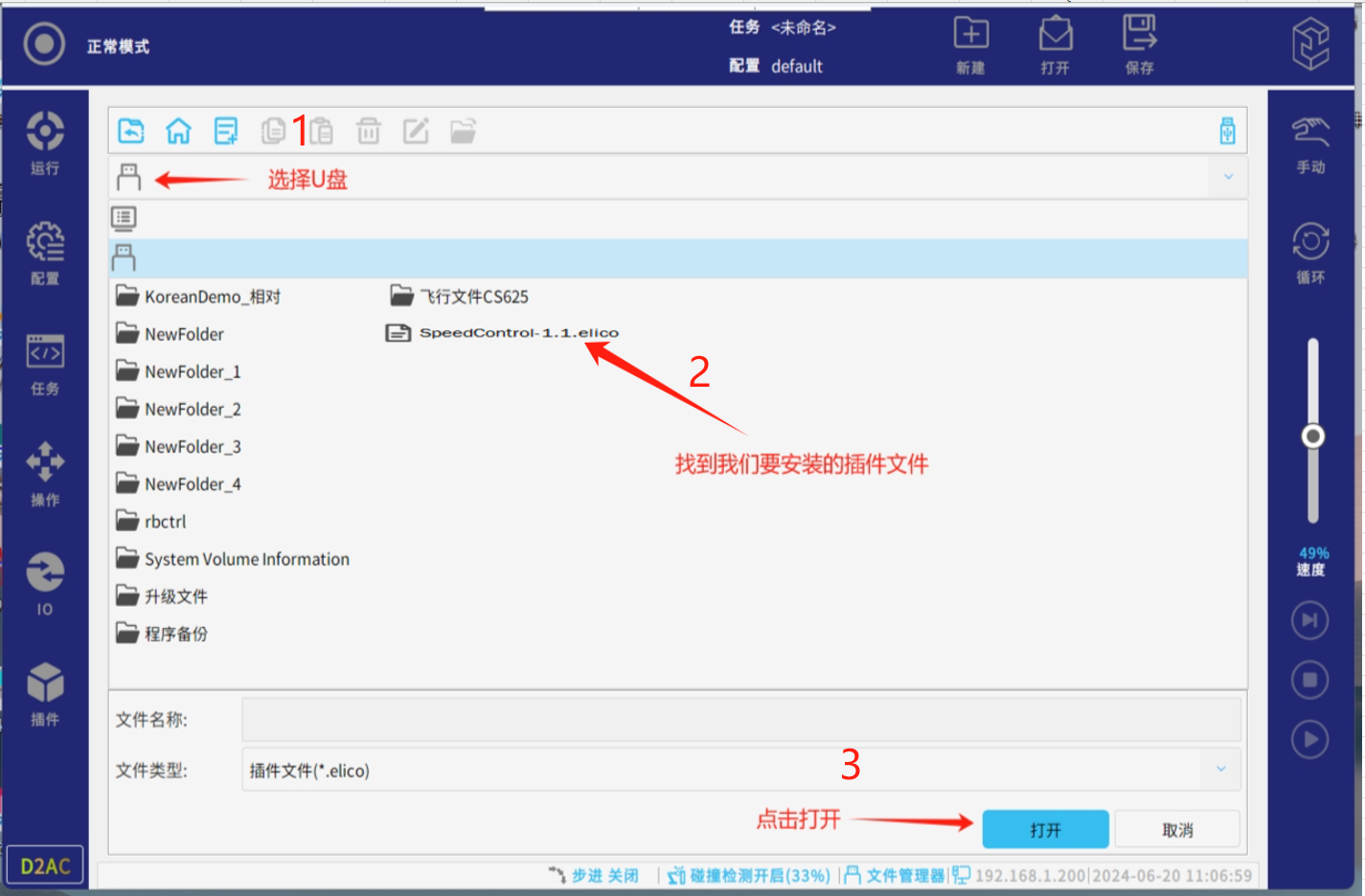 CS机器人在与外部设备进行通讯时,通常会使用机器人内部的寄存器进行信息交互,机器人自带可查看modbus寄存器,关于布尔寄存器、整数寄存器、浮点数寄存器的查看可安装寄存器监控器插件进行查看,插件文件询问milan.米兰中国人员方可获得,存放至U盘内,并插入机器人示教器或控制柜USB接口。