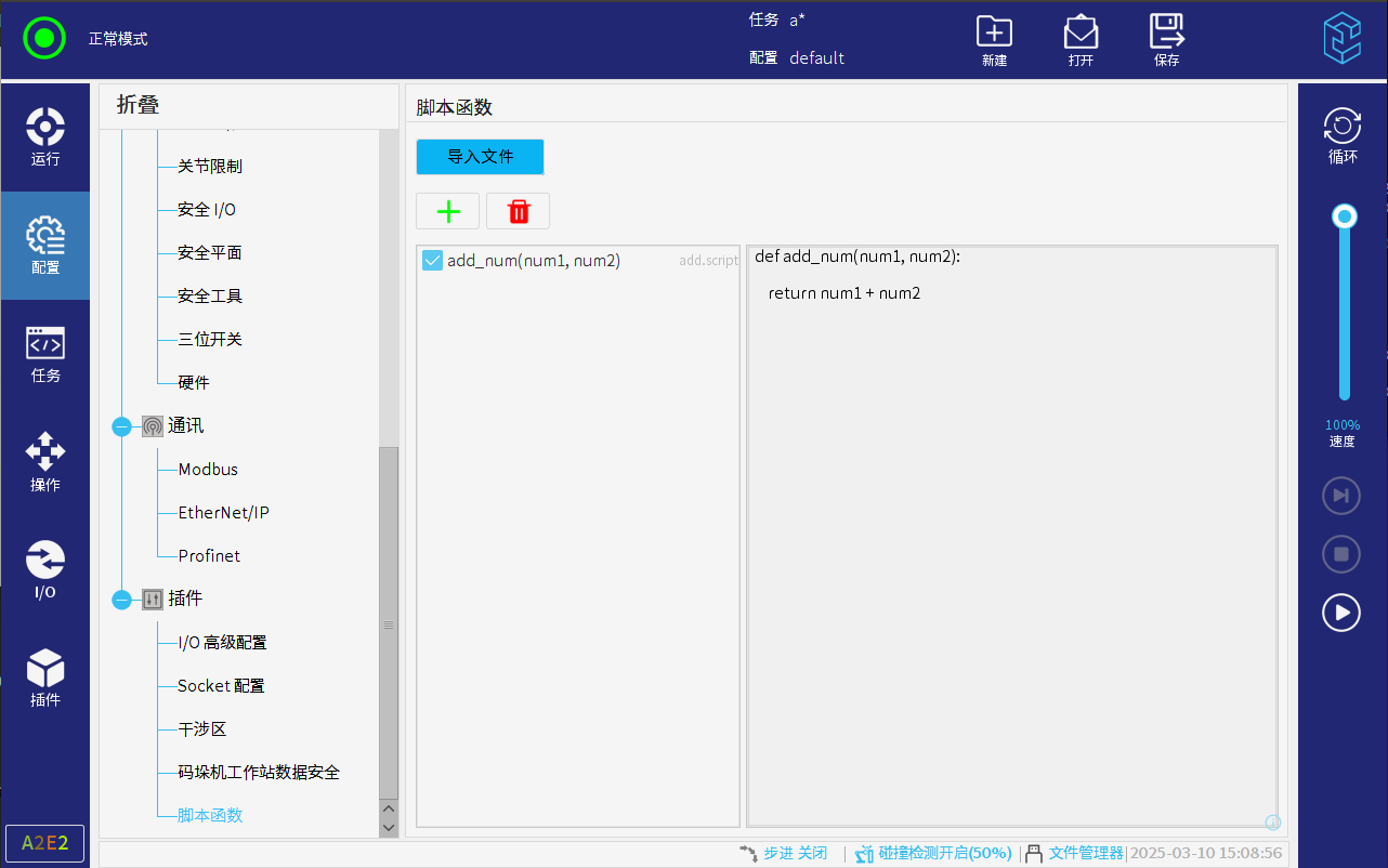 ScritptFunction是一款支持函数库自定义的插件,用于用户直接在插件中定义好脚本函数,可以直接通过示教器表达式键盘插入函数功能,实现函数调用,减少现场工程师编写任务树的工作量,如坐标变换、等待超时、 位姿偏移等,语法需支持Python格式。