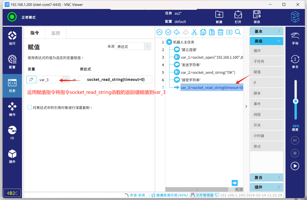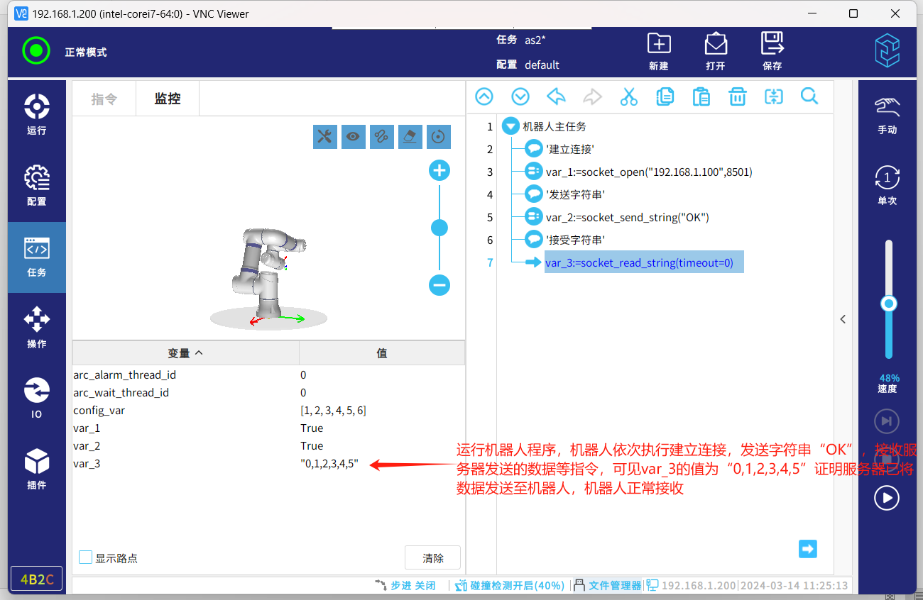 socket通信协议,一种标准的通信协议,同时是目前工业电子设备之间常用的通讯协议,市面上机器人与夹持器,视觉,上位机等通讯大多采用这种通讯方式。以下介绍机器人socket通讯基本的几个指令脚本,传输字符串数据和解析字符串数据。