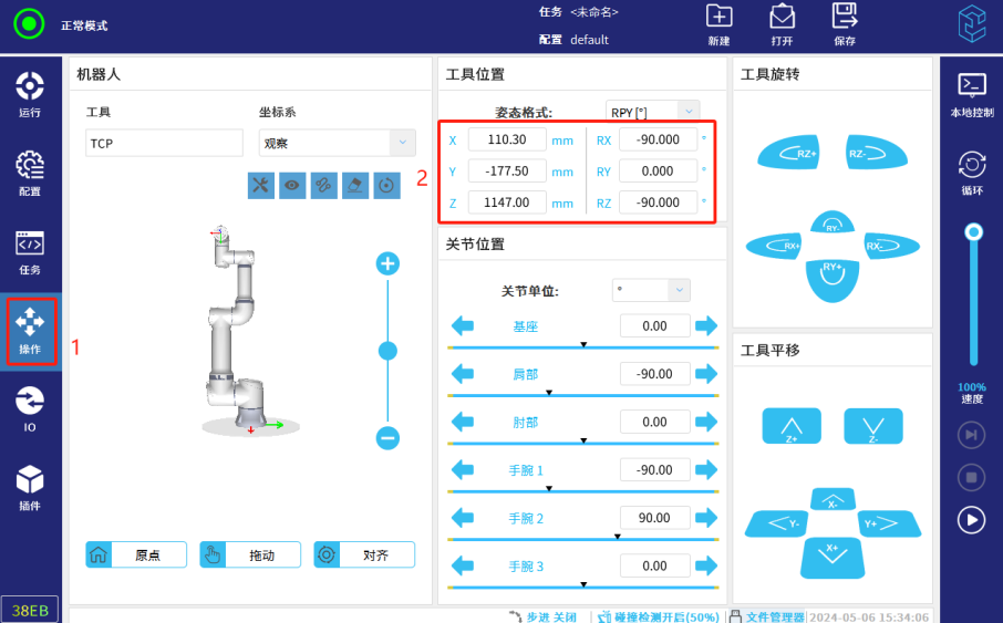进入下图页面,在右侧修改对应型号六轴姿态角度(具体查看本文档新/旧各机型打包姿态角度),点击“确定”,确保空间足够后按住“自动移动”