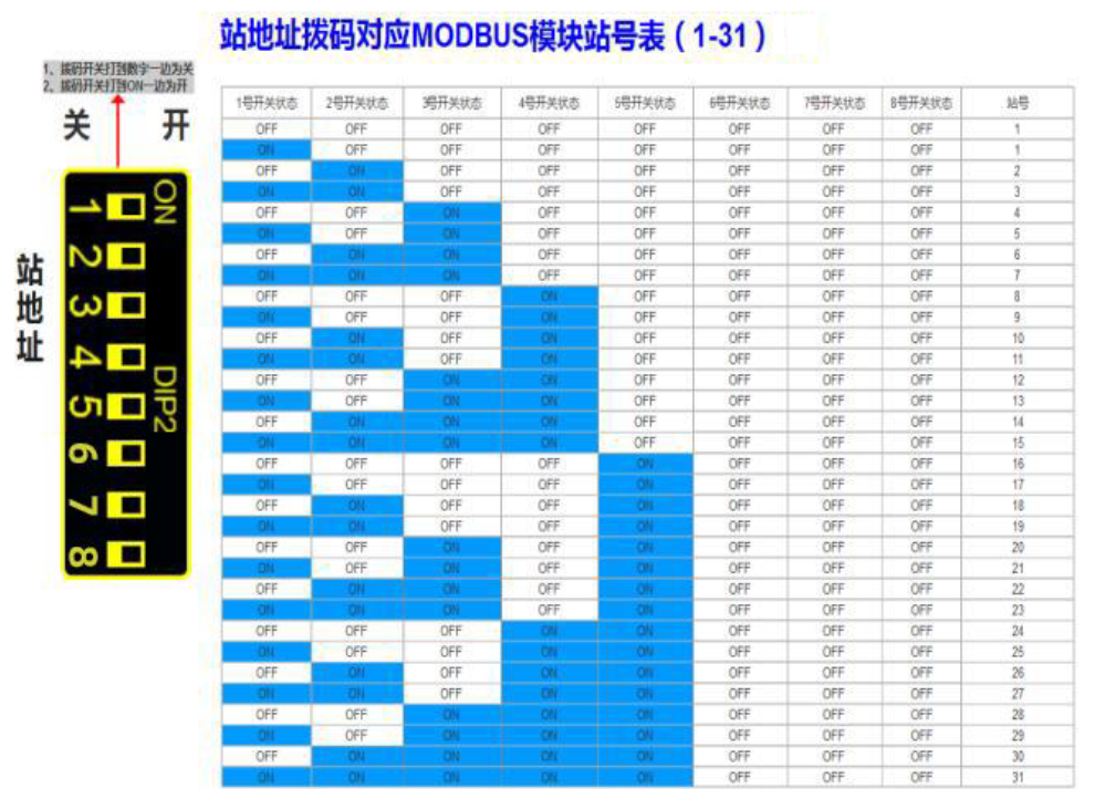 ● 修改站号的范围在 1~32,必须通过调整模块上“站地址”拨码开关的状态设置,注意当模块上电时调整拨码状态时,需将模块断电至少 3S,再上电方可生效。具体对应关系如下表中所示(出厂时所 有拨码为 OFF)。